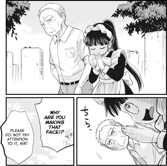 At the very start of the story, Yoshioka is resolutely set in his ways. He whiles away his days in an old house slowly falling into ruin. He has no one to keep him company or share his thoughts with. As we learn, he is a widower whose beloved wife Chiaki passed away after a long illness. The seemingly empty house is not truly vacant - wherever he goes, Yoshioka sees the ghosts of days past. In his mind's eye, his now middle-aged children, long since gone, still run through the dining room and play animatedly in the backyard. Ponko inadvertently disrupts his plan of wasting away in solitude. Her endearing incompetence forces him to rise to the challenge of fixing her screwups.