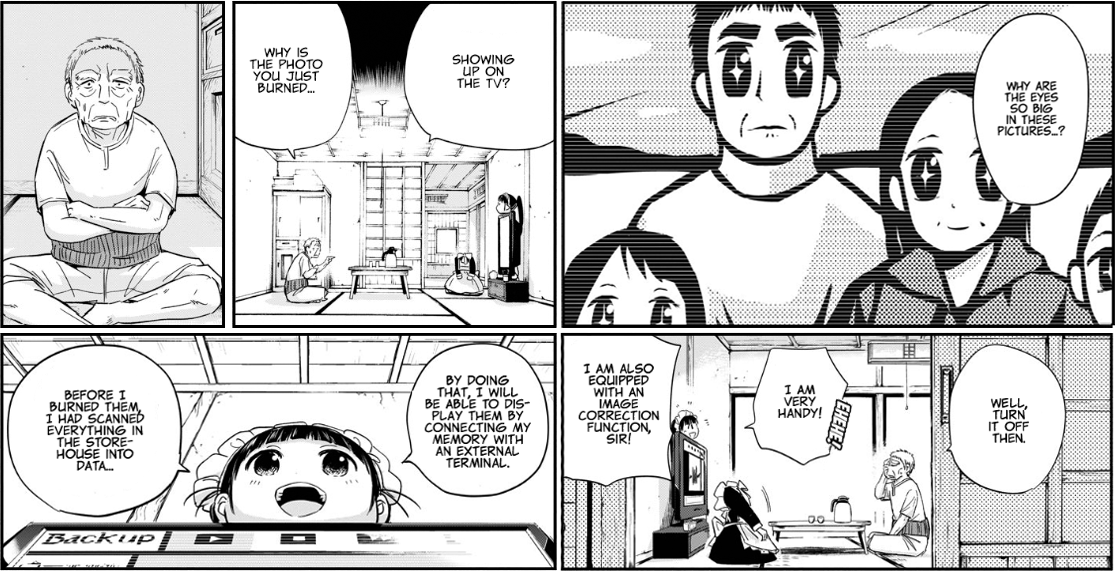 Yatera is quite upfront about his influences. Readers of a certain age - or of a certain taste - will see echoes of Yokohama Kaidashi Kikou's gentle post-apocalyptic setting in the world that he weaves around Yoshioka and his incompetent robotic assistant. As these stories tend to unfold, the old man slowly warms to Ponko, and soon enough she becomes an integral part of the village's close-knit social life. There's a bar-cum-café where the oldies gather, a ragtag group of kids and tweens always ready for mischief, and the other Yoshioka family members living their glamorous urban lives in the capital, all business-like and proper whenever they deign to visit.